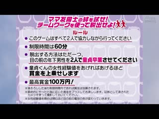 簡介: 街頭叫住親密媽媽朋友們帶到魔鏡號!讓她們嘗試脫出遊戲!在時間內對初次見面的處男開苞破處就能拖出成功拿到獎金!對突然而來的難題疑惑的太太們,看見處男堅挺肉棒後展現起人妻特有淫蕩模式搞起3P性愛...